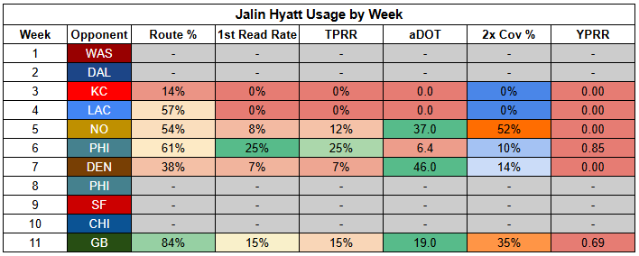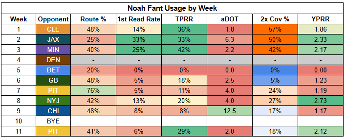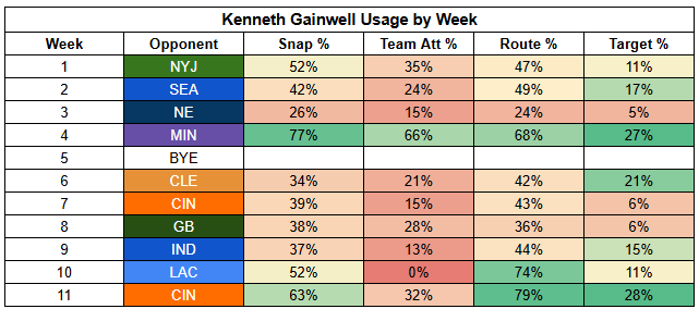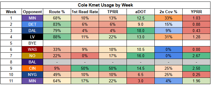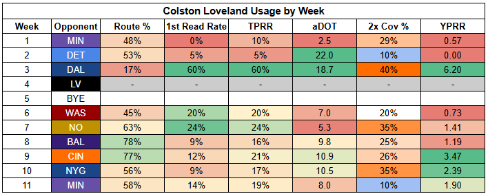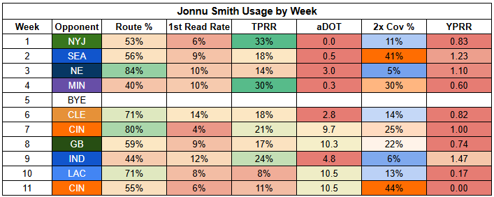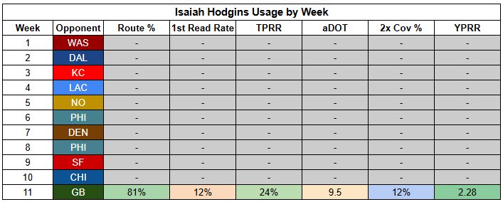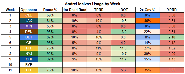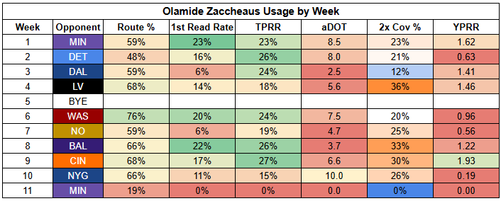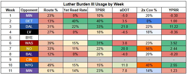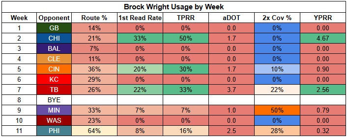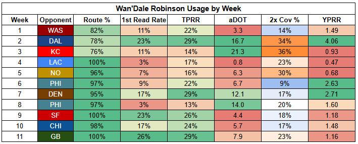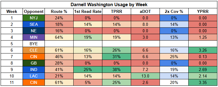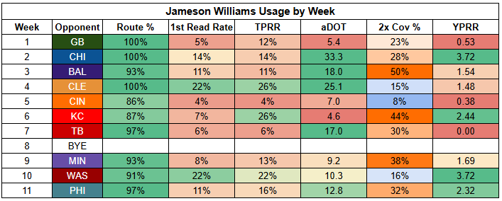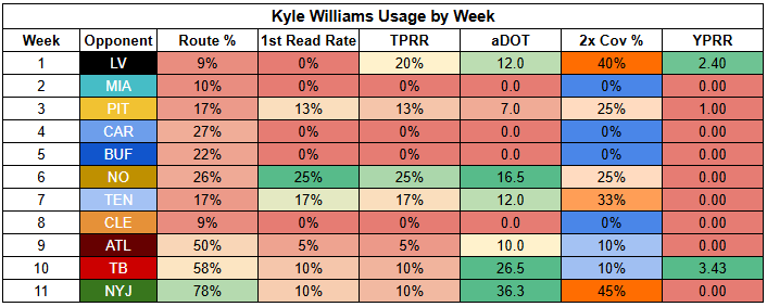 Williams also saw his first-read target rate drop to just 11% last week. He was more involved than usual, but that says more about where "usual" has been than being a bullish takeaway from Week 11.