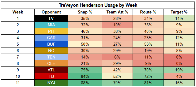 Rhamondre Stevenson has also returned to practice—listed as limited on both Wednesday and Thursday. His return will reduce TreVeyon Henderson's touches. But there's a difference between cutting into Henderson's workload and displacing him as the starter. The former is a given; the latter should not be assumed.