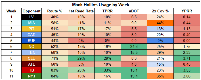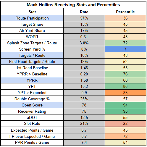 With Diggs spending nearly half of his snaps in the slot, there should be room for both Boutte and Hollins to run routes at near-full-time rates. Hollins is a WR5 here, as a bet on a strong day from Maye.