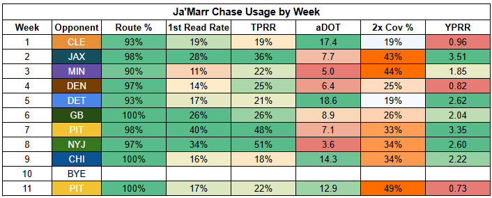 Flacco's run of strong efficiency was built on feeding Ja'Marr Chase the ball. Last week, the Steelers were able to take Chase out of the game. They also contributed to him missing this game entirely, with Chase suspended for spitting on Jaylen Ramsey.
