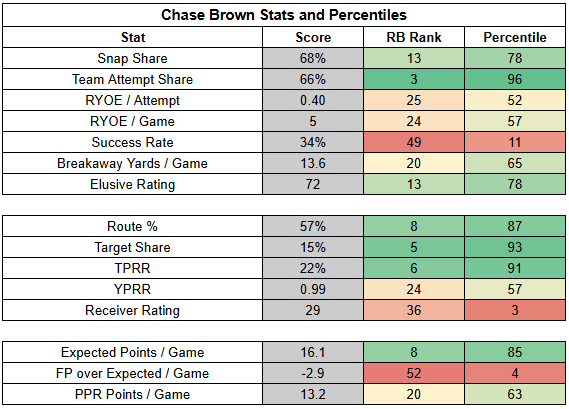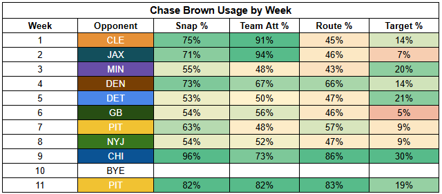 With Samaje Perine out of the lineup, Chase Brown has absolutely dominated backfield snaps and touches.