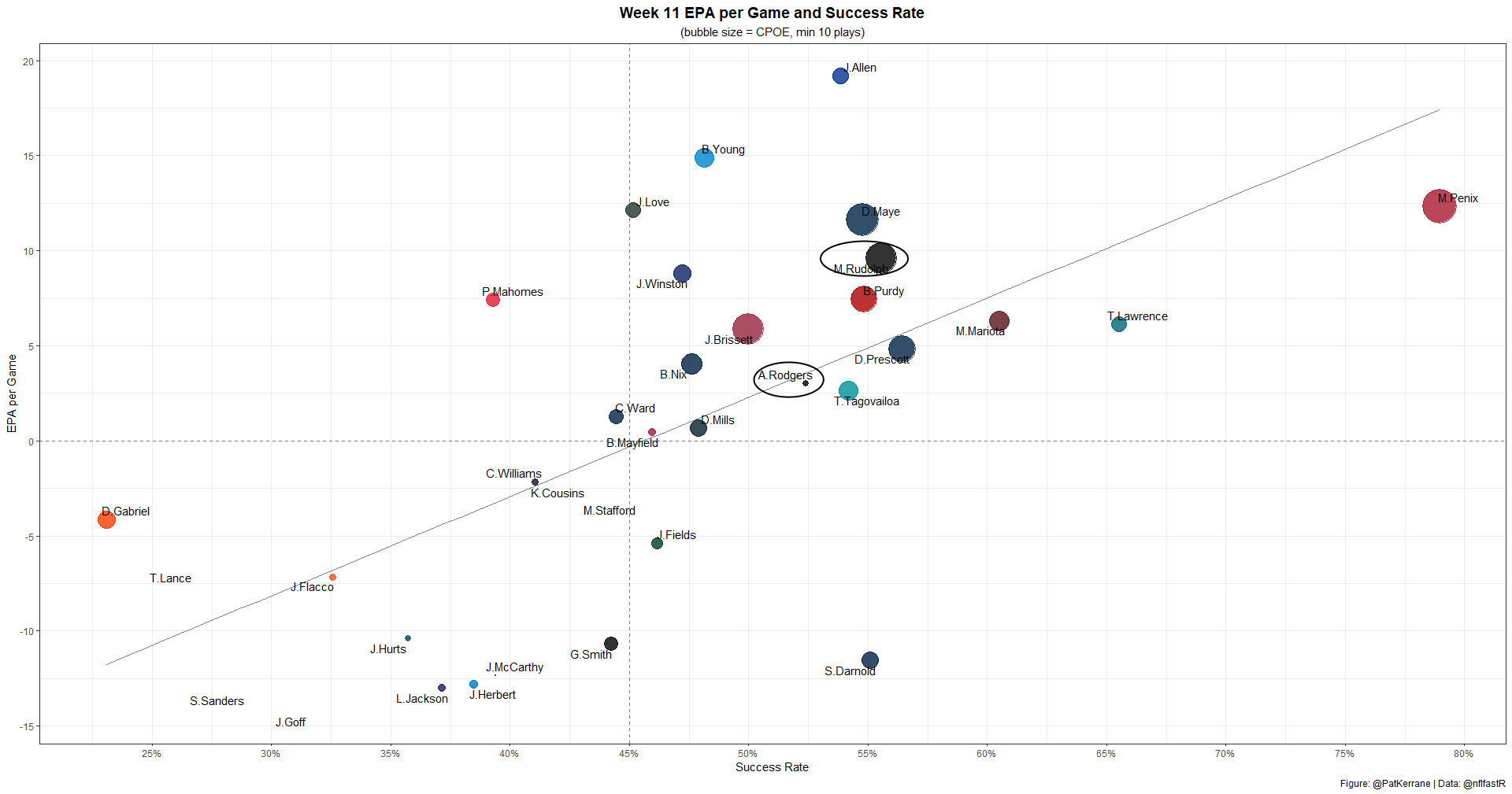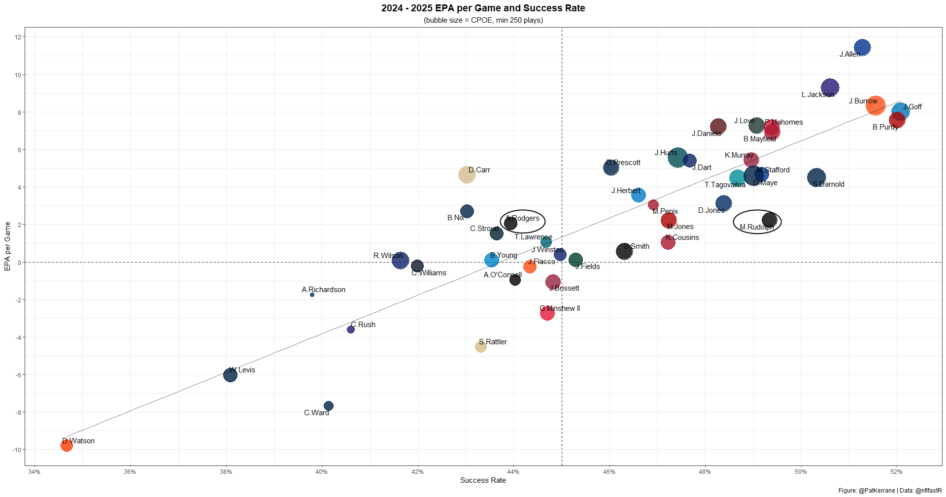 Rodgers' EPA per game over the last two years is very similar to Mason Rudolph's, who filled in reasonably well in Tennessee last year. Rudolph's success rate is much stronger, as well.