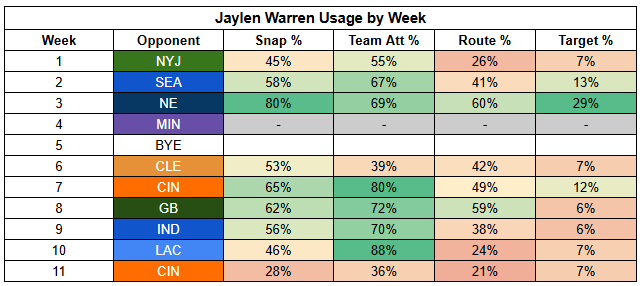 Jaylen Warren was injured against the Bengals, significantly reducing his playing time.