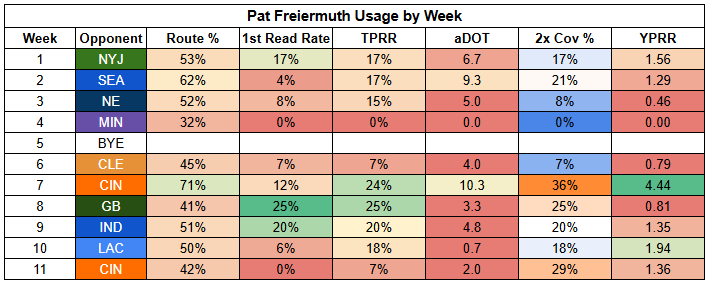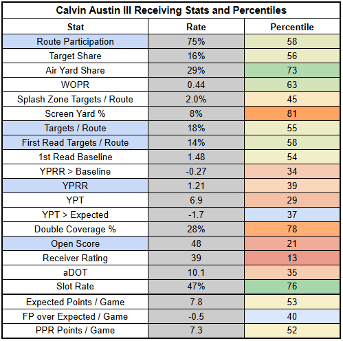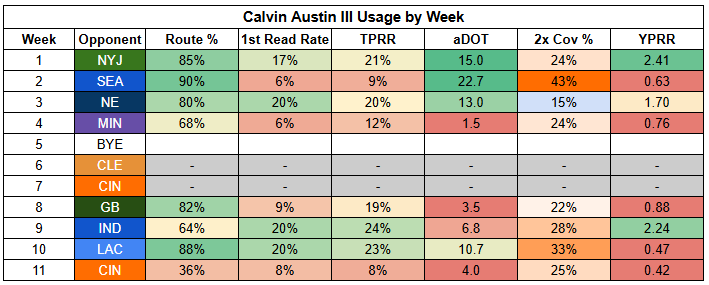 The potential for heavy personnel also makes Calvin Austin's outlook shakier. He fell to just 36% route participation last week, with Roman Wilson at 64%.