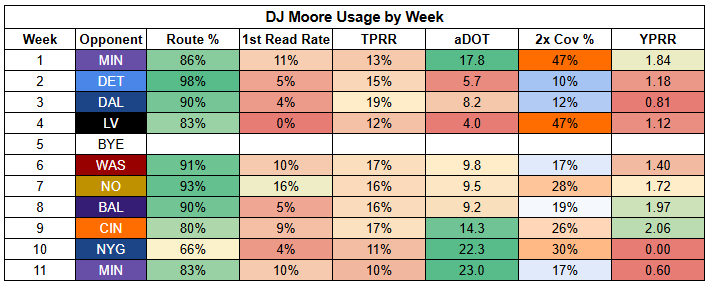 DJ Moore looks much riskier than Odunze and has much weaker upside. He's a solid bet for routes, but is just a WR5 here.