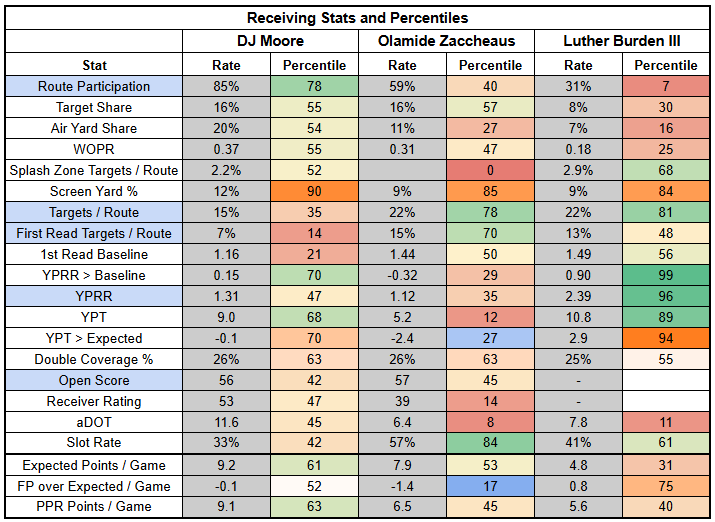 Moore's outlook is slightly weakened by the Bears' new slot WR, Luther Burden. Burden flipped Olamide Zaccheaus last week, logging a season-high 61% route participation with 52% of his snaps in the slot.