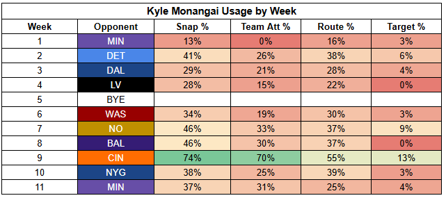 Kyle Monangai's role over the last two games has been very similar to his pre-Week 9 usage.