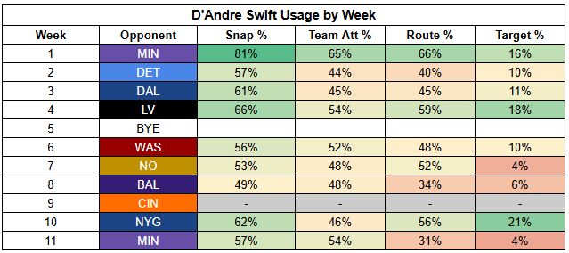 D'Andre Swift is set to lead the backfield this week, after retaking his starting role in Week 10.