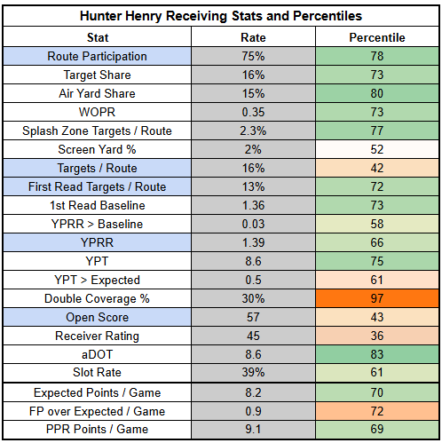 Hunter Henry has been double covered at one of the highest rates in the league, but the Bengals don't double team very frequently, so this matchup could represent a bit of a reprieve there. More than anything else, though, Henry is a bet on a matchup where Maye should be very efficient and a game environment that could be very fun if Burrow is able to play. Henry is a TE1.