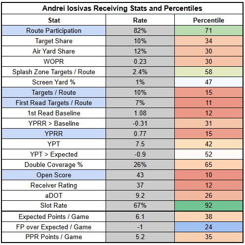 Andrei Iosivas should see a bump in route volume with Chase out. But Iosivas already runs routes at a pretty high rate. The issue is that he rarely earns targets.