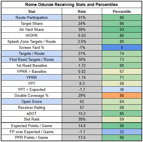 If big-play hunting on the Bears' side, Rome Odunze looks like the best bet. The Steelers are playing man at a 33% clip, the fourth-highest rate in the league. Against man, Odunze has a 28% TPRR with 2.27 YPRR. This matchup should reinforce the usual pecking order, with Odunze on top.