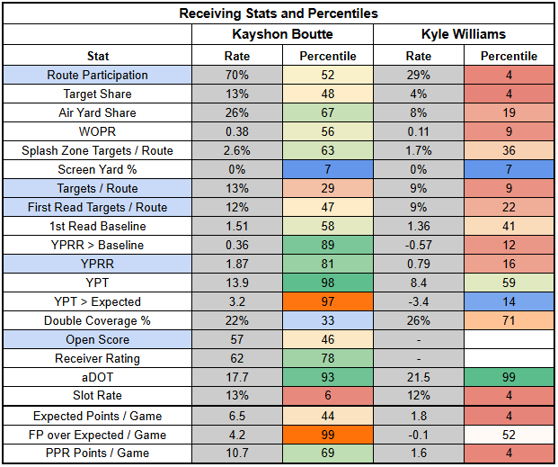 Williams has a ridiculously long 3.39-second time to throw, the slowest in the NFL. But Williams is attacking downfield and scrambling well. We're getting some playmaking here, even as we're also dealing with inconsistency and the potential for big negatives.