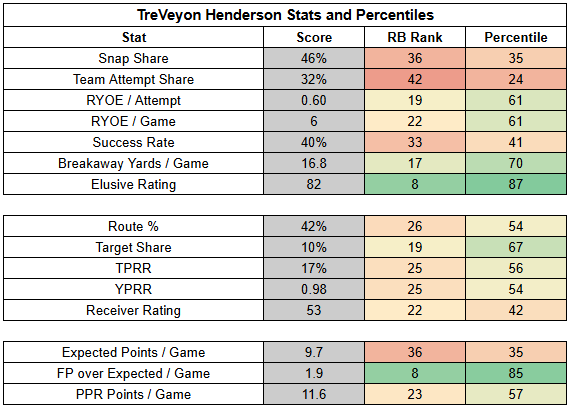 Even with Stevenson back, Henderson profiles as a high-end RB3 as a bet on his explosiveness in an enticing game environment. Stevenson is an RB3 as a bet on a TD and positive game script against a weak defense.