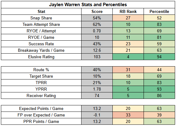 It's worth noting that most of Gainwell's value has come from being a receiver. Assuming Warren is good to go, Gainwell will be better off if the Steelers, who are 2.5-point road underdogs, trail in this game.