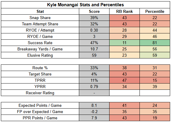 And, even with Monangai's very strong Week 9 performance, this usage is defensible. Monongai has been very consistent, but doesn't offer a ton of burst.