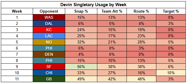 With Austin playing 47% of his snaps in the slot this year, he's susceptible to a lack of 11-personnel. After starting to look like he was firmly in WR5 territory with strong route participation since returning from injury, Austin isn't really even in dart-throw consideration here.
