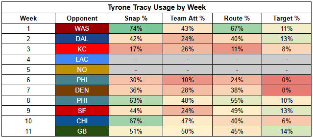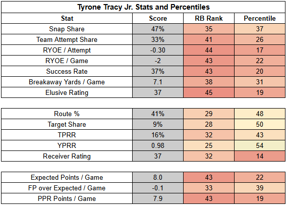 Tracy is just as inconsistent as Singletary, and just as unexplosive. And while Tracy is significantly more involved as a receiver, he's hardly profiling as a playmaker there.