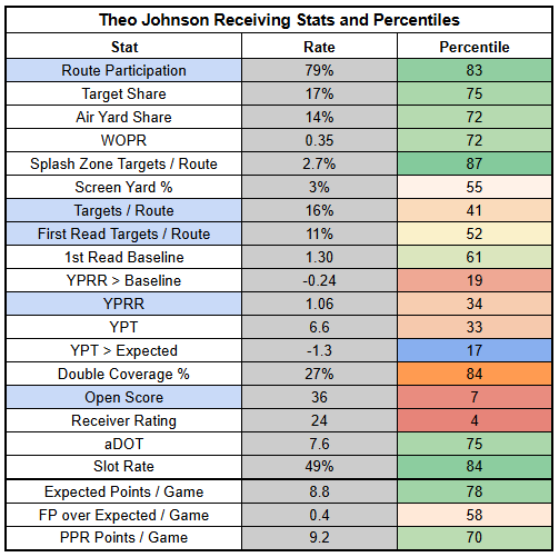 Theo Johnson is a very safe bet for routes, but he's not profiling as much of a target earner, and he's been very inefficient as a yardage producer. He has a strong role around the goal line, though, and is a high-end TE2 as a bet on a TD.
