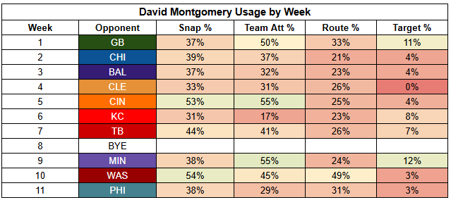 Campbell's original statement came after Montgomery handled just 17% of carries against the Chiefs. He brought up Montgomery's workload again after he saw just 29% of carries against the Eagles.