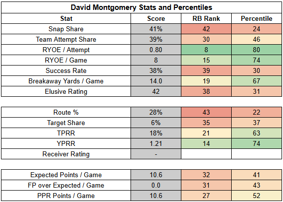 Montgomery, meanwhile, is far less interesting than Gibbs. He's been less consistent than Gibbs while also lacking the elite breakaway ability of his running mate. And with a weak receiving role, Montgomery is very TD dependent.