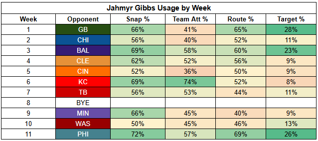 It's pretty clear that Campbell is looking for Montgomery and Gibbs to have close to an even split, as we saw, for example... against the Commanders. Against Washington, Montgomery and Gibbs both handled 15 carries. Gibbs ripped off 142 yards and scored two TDs. Montgomery turned in 71 scoreless yards.