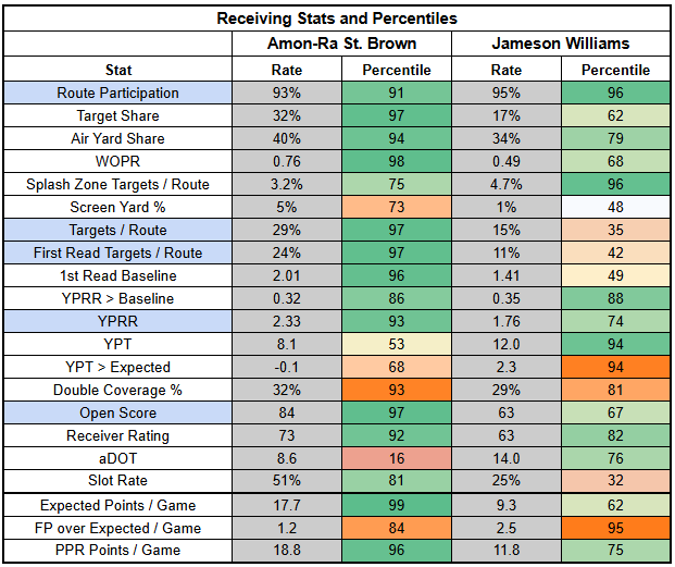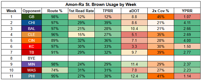 Against man coverage, St. Brown has a TPRR of 40.5%, the highest in the NFL, just ahead of CeeDee Lamb (36%), AJ Brown (35%), and Puka Nacua (35%). St. Brown also has 3.00 YPRR against man.