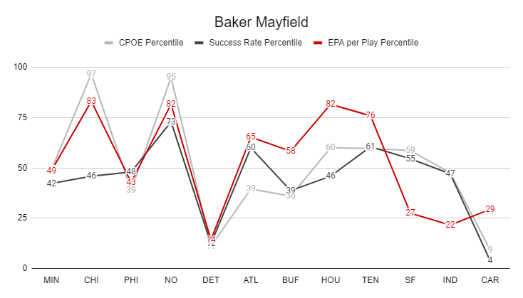 Baker Mayfield just turned in his third bad game in a row in EPA per play. And concerningly, he paired that with his worst marks of the season in success rate, and completion percentage over expected.