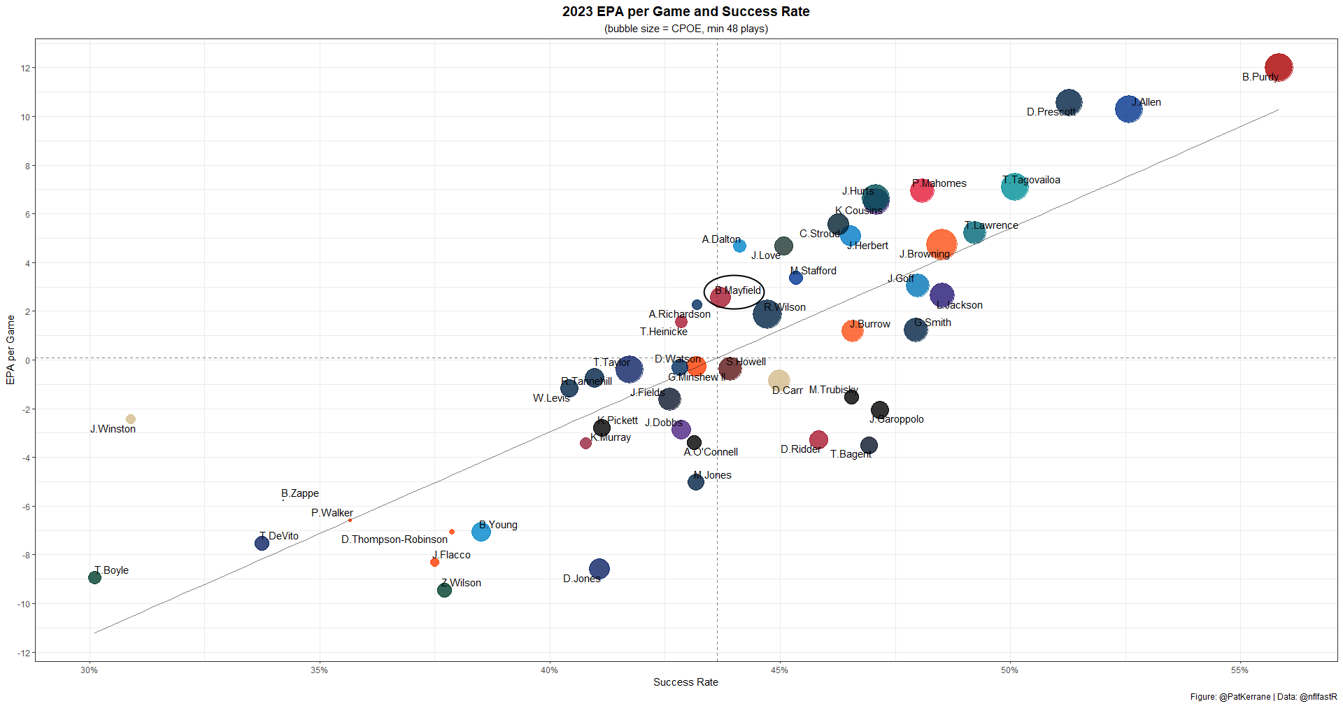 It’s been a while since he’s played impressively. But overall, Mayfield hasn’t been bad this year, ranking QB17 in EPA per game and QB26 in success rate.