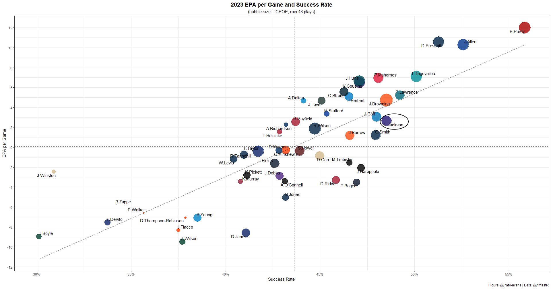 Ultimately, Flowers and Beckham are a bet on Jackson. And Jackson is flashing as a positive regression candidate, ranking QB6 in success rate but just QB16 in EPA per game.