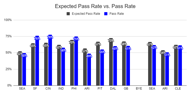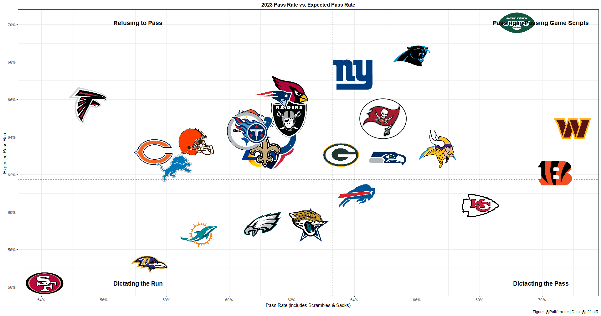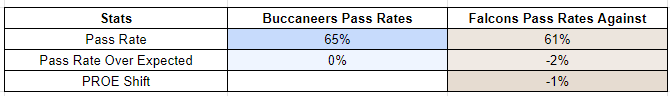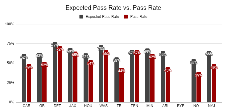 Normally, the Buccaneers are willing to pass the ball at a decent rate. Their 65% pass rate is two points above the league average. But Tampa Bay is generally passing because they’re in game scripts that encourage it.