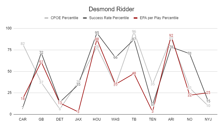 Ridder was excellent before the Falcon's Week 11 bye but fell off considerably in tough matchups against the Saints and Jets. He’s down to QB36 in EPA per game.