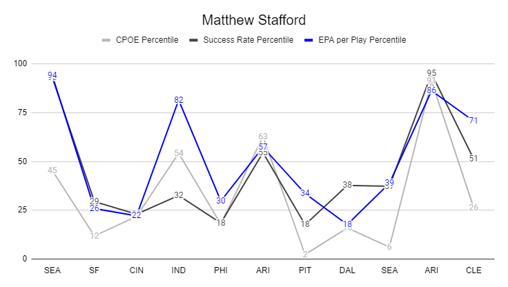 Two weeks ago, Matthew Stafford played great against the Cardinals. That makes sense, the Cardinals' defense stinks. But his strong performance against the Browns was definitely a surprise. Against an elite Browns defense, he delivered a 71st-percentile EPA per play.