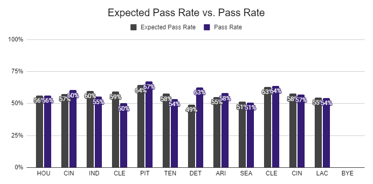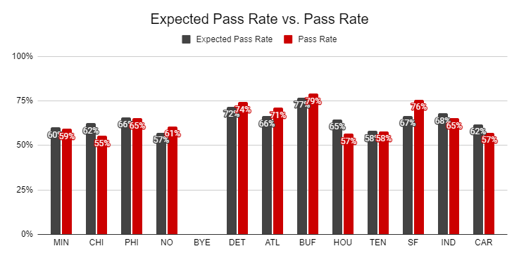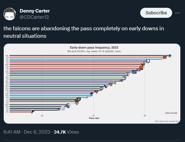 Since Desmond Ridder returned to the starting role, the Falcons' highest pass rate was last week’s 49% mark.