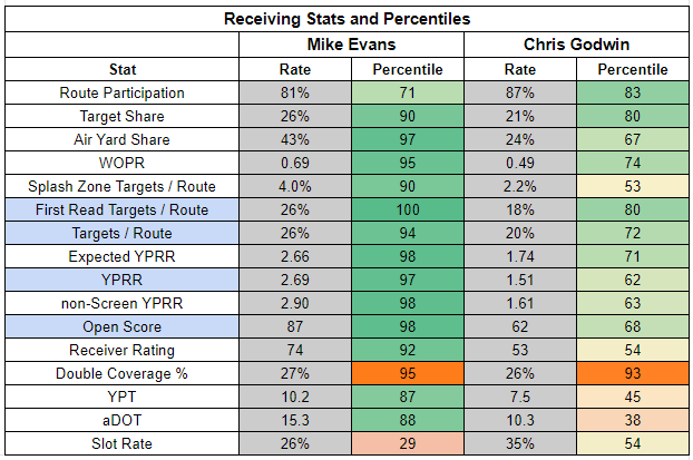 Stafford gets a difficult test this week, though. The Ravens rank second in EPA allowed per dropback and third in dropback success rate. They’re also excellent against first reads and limit big plays. This is about as formidable a secondary as there is.