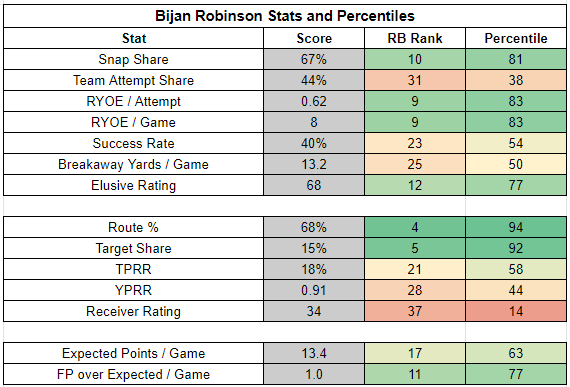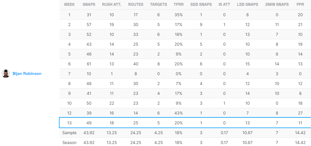Bijan Robinson is coming off a disappointing PPR performance, but he’s also coming off 23 opportunities—his third straight game of 22+. Robinson’s share of carries won’t be super impressive. But there should be plenty of carries to go around.