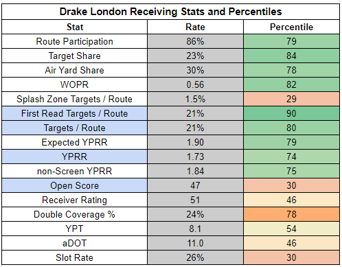 Things are much tricker in the receiving game. Drake London is the clear No. 1 WR, but he’s bringing unimpressive route running and middling efficiency to the table. He shapes up as a FLEX.
