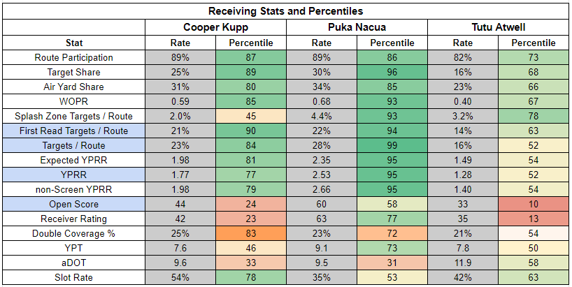 Cooper Kupp has posted 100% route participation in back-to-back weeks… which is low-key concerning. Despite running every route, Kupp has just 57 combined yards, delivering a 0.80 YPRR.
