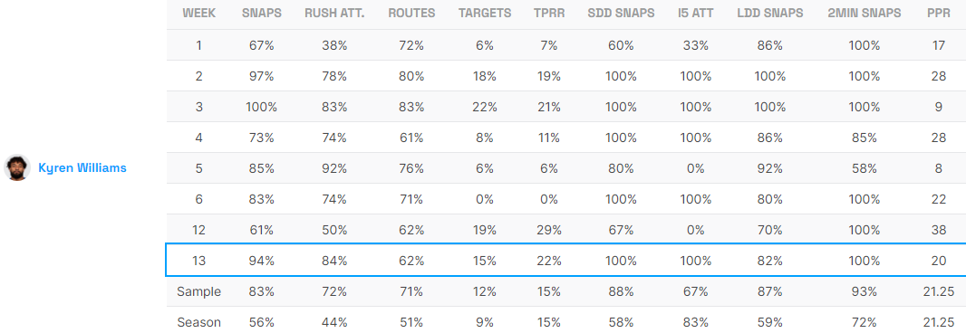 Kyren Williams is locked in as the top RB, handling a ridiculous 94% of snaps against the Browns, and 84% of carries.
