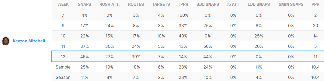 The Rams' middling run defense also creates upside for Keaton Mitchell. Mitchell has seen his playing time steadily increase and giving him a bigger role out of the bye would be an obvious pivot.
