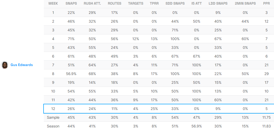 The Ravens have yet to hit a 68% pass rate this season. This is not an especially high mark. By comparison, the Bengals and Jets have hit this mark in 8-of-12 games. The 49ers are the only other team yet to have hit a 68%+ pass rate this season.