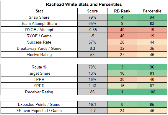 Rachaad White continues to dominate snaps and touches, but he just doesn’t look like a very good runner. Against the Panthers, he posted an abysmal 26% success rate, contributing to a subpar 37% rate this year. And he’s not bringing much explosiveness to the table either.