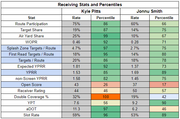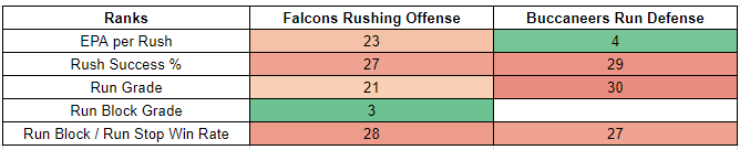 The issue for Falcons receivers is that even though the Buccaneers can’t stop the pass, their run defense is very overrated. Despite ranking fourth in EPA allowed per rush, they’re 29th in rushing success rate. If the Falcons want to establish it, Tampa Bay isn’t going to stop them.