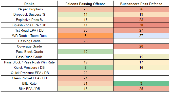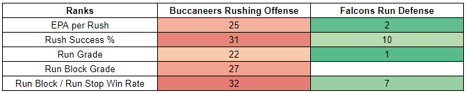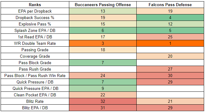 Even if the Buccaneers lean into the passing game a bit, we have efficiency concerns. The Falcons are fourth in dropback success rate allowed, and look capable of frustrating Mayfield even without a pass rush. The Buccaneers rank just 22nd in EPA per dropback with a clean pocket.