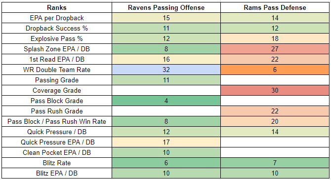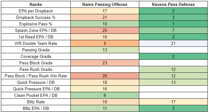 But the Ravens have had two weeks to prepare for a Rams team that has been very vulnerable in coverage. Los Angeles ranks 30th in PFF’s coverage grades and isn’t defending the middle of the field well—which the Ravens are happy to attack.