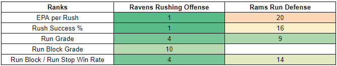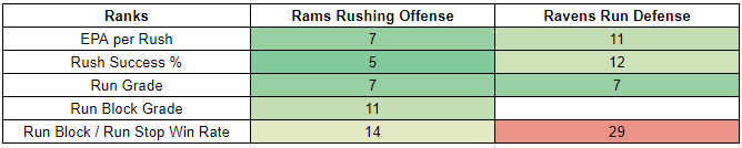 Jackson will also be facing a Rams defense that ranks just 20th in EPA allowed per rush, boosting his rushing potential.