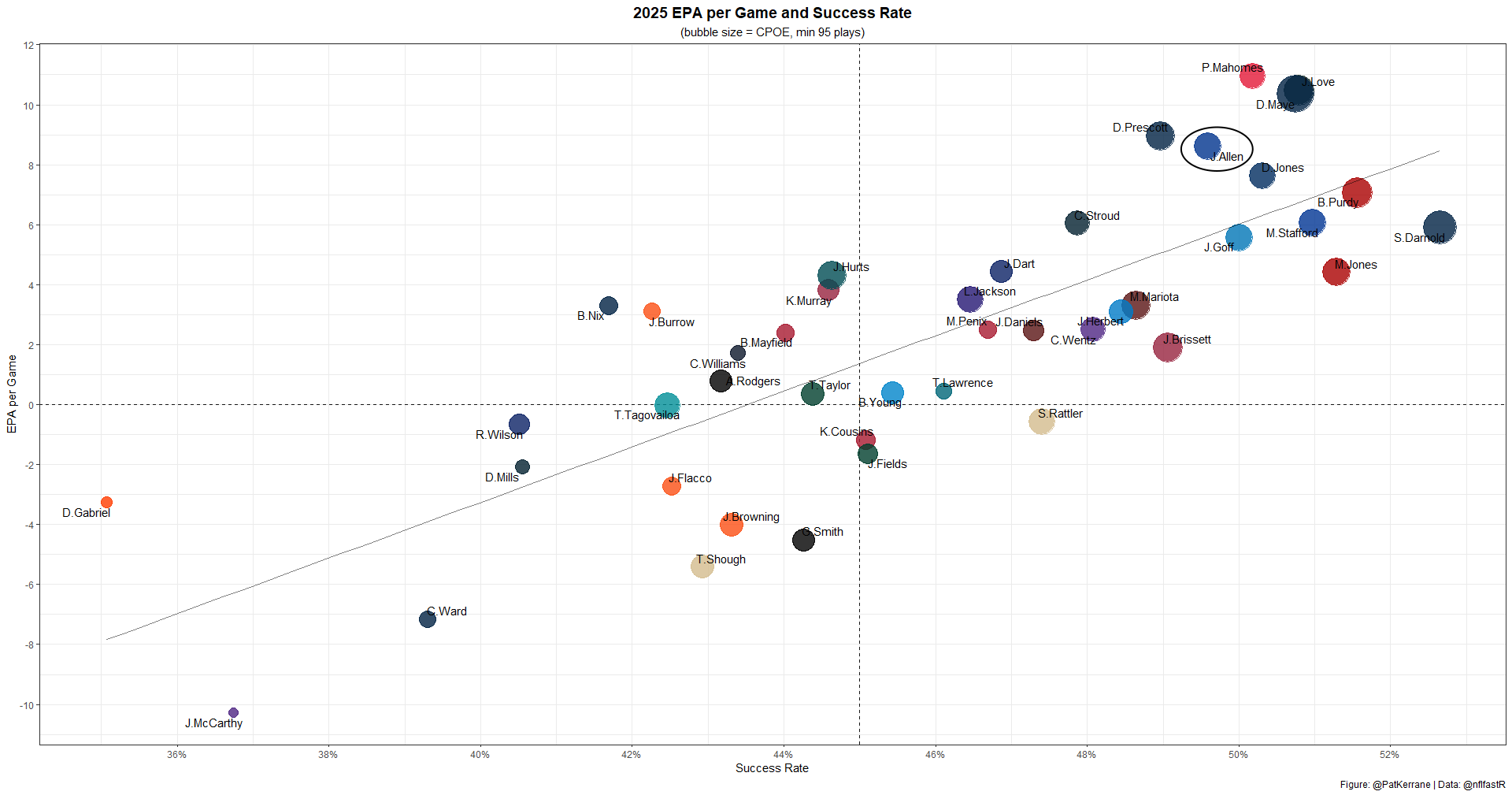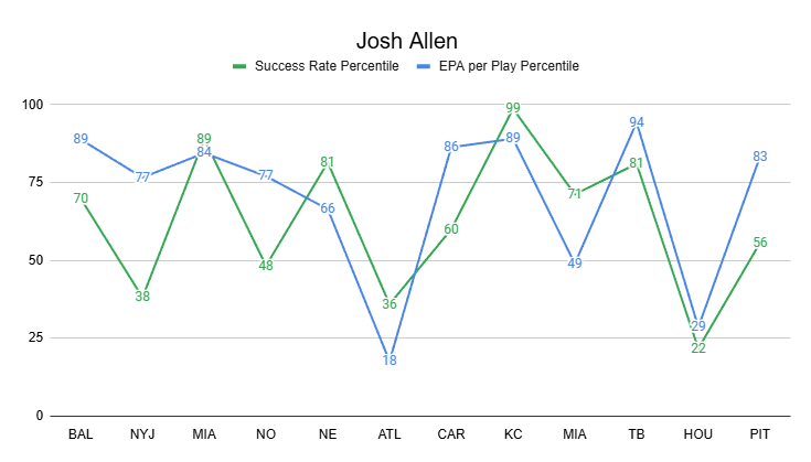 Allen has had a couple of duds this year, but he's been mostly excellent when looking at his EPA per play by week. Allen actually ranks higher in EPA per play (QB4) than in EPA per game (QB5)—another way of highlighting that the Bills are actively limiting his dropback volume.