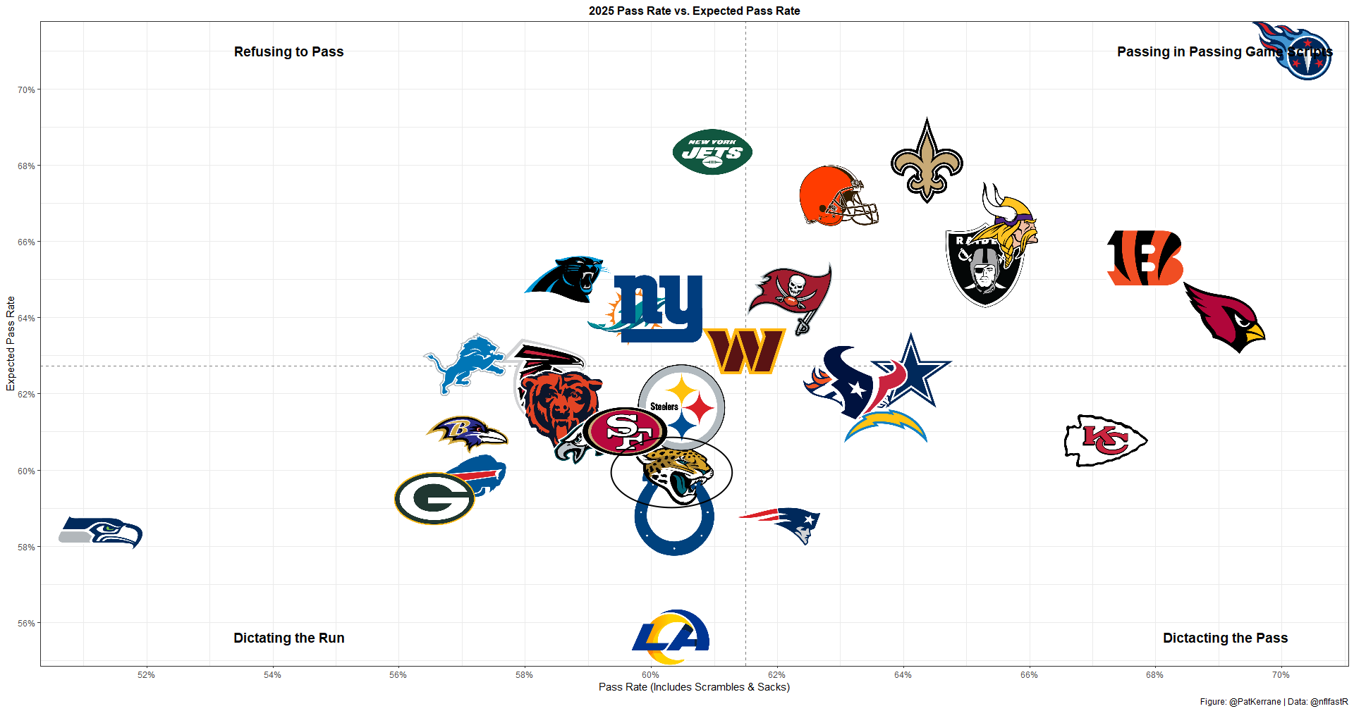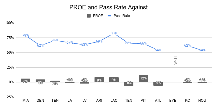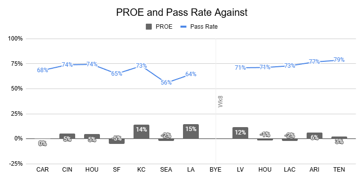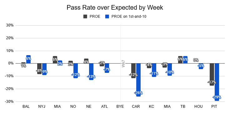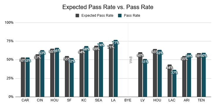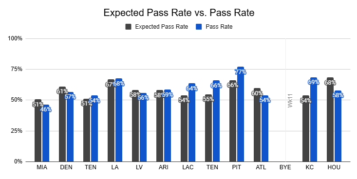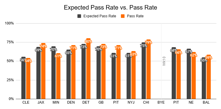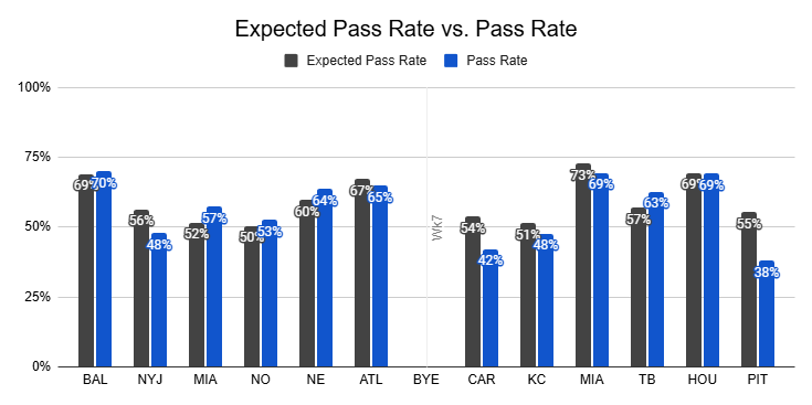 Against the Steelers, they posted just a 38% pass rate, their lowest of the year.