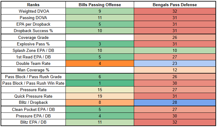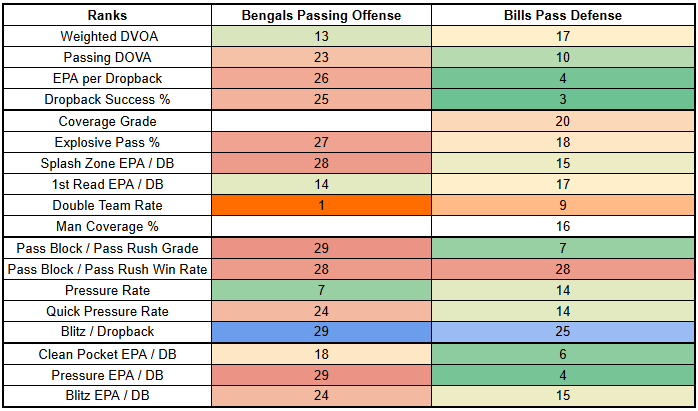 The good news for the Bengals is that Joey Bosa is expected to miss this game after logging back-to-back DNPs with a hamstring injury. This represents a major blow to a pass rush that has been solid but unspectacular this year. Among all players at EDGE and DT with 200+ snaps, Bosa ranks sixth in pass rush grade. After Bosa, the Bills have some solid pressure players. DaQuan Jones ranks 38th, Greg Rousseau ranks 44th, and Deone Walker ranks 50th—but only Bosa is a true difference maker.