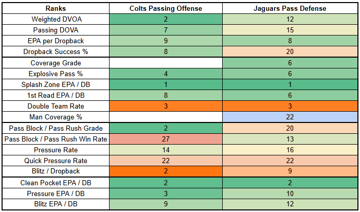 That's good news for Trevor Lawrence, who will be going against a Colts defense that doesn't rush the passer well, especially with DeForest Buckner out for at least another week. The Colts will also be without Sauce Gardner for this game.