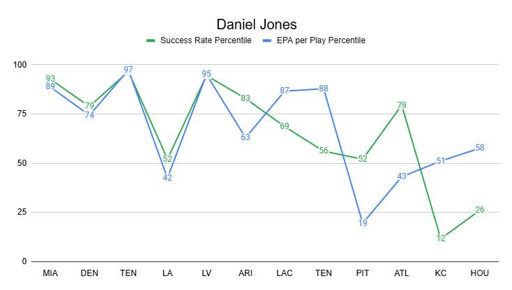 Daniel Jones played through a fractured fibula against the Texans, posting strong leg-fracture-adjusted efficiency.